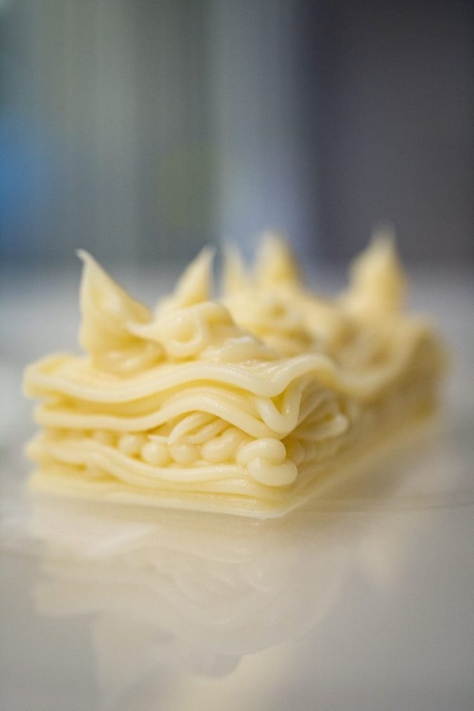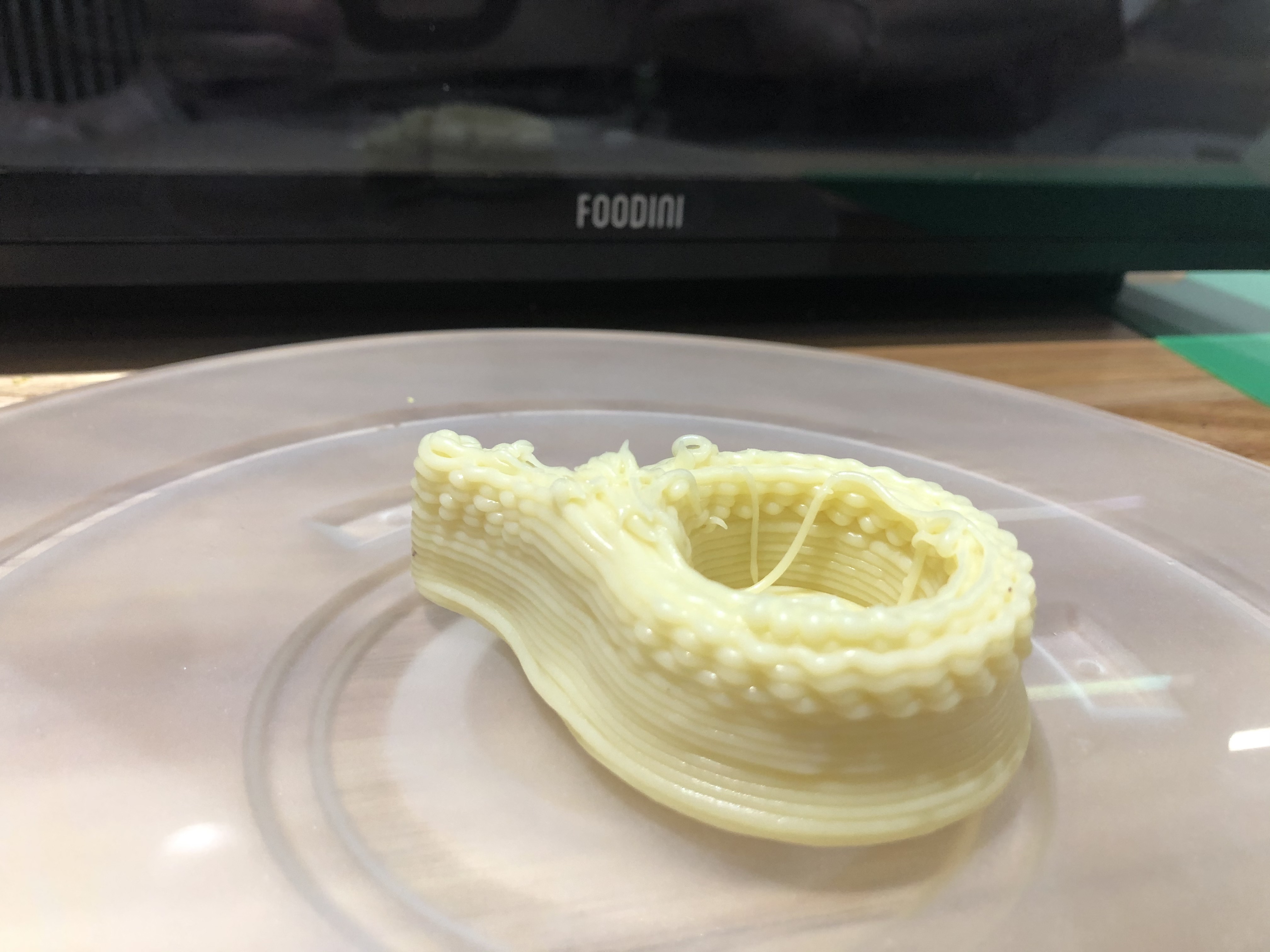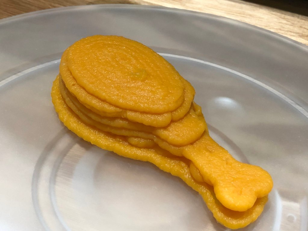 Take a look at the printer interface and printing shapes, filmed in ProtoSpace UTS in November 2020White chocolate ganache (home-made) printed in a custom-designed ‘Lego’ shapePuree guacamole made of ‘avocao’ + ‘sour cream’ to IDDSI Level 4 (Smooth puree)Puree pumpkin made of ‘sweet butternut pumpkin’ to IDDSI Level 4 (Smooth puree)Choosing the ‘volcano’ shape on the Foodini printerPrinting the ‘flat’ shapes with chocolate icing (like ganache)The chocolate ganache (home made) ‘spoon’ shape failed at the top – see the wriggly lines!